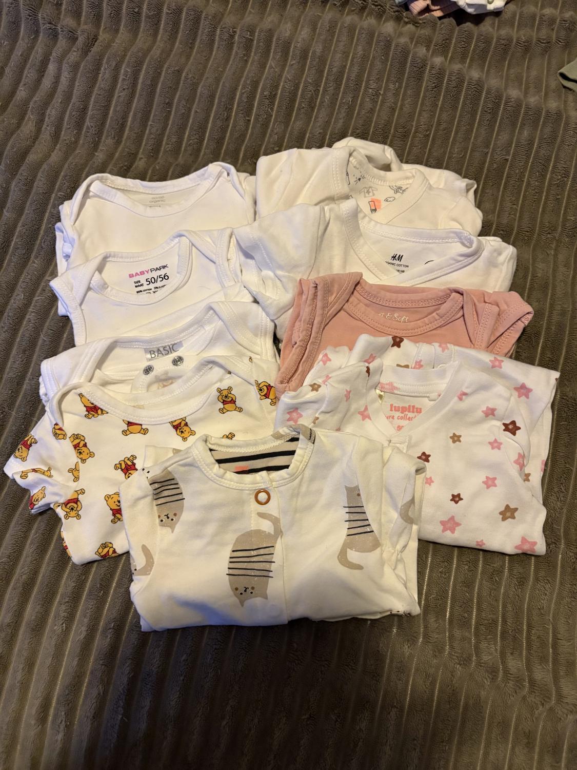 Pakket van rompertjes, boxpakjes, broekjes, shirtjes, mutsjes en twee inbakerdoeken voor een newborn. Maar 44/50. Uit een rookvrij huishouden alles gewassen met parfumvrij wasmiddel.